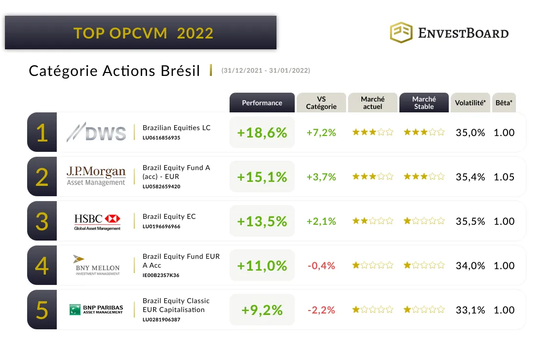 Dans ces conditions les différents classements ci-dessous nous permettent de mettre en lumière les OPCVMs de la catégorie Actions Brésil dans différents scénarios.