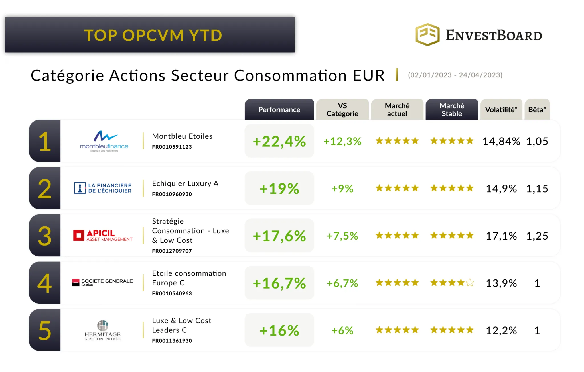 Dans ces conditions, les différents classements ci-dessous nous permettent de mettre en lumière les OPCVMs de la catégorie Actions Secteur Consommation dans différents scénarios.