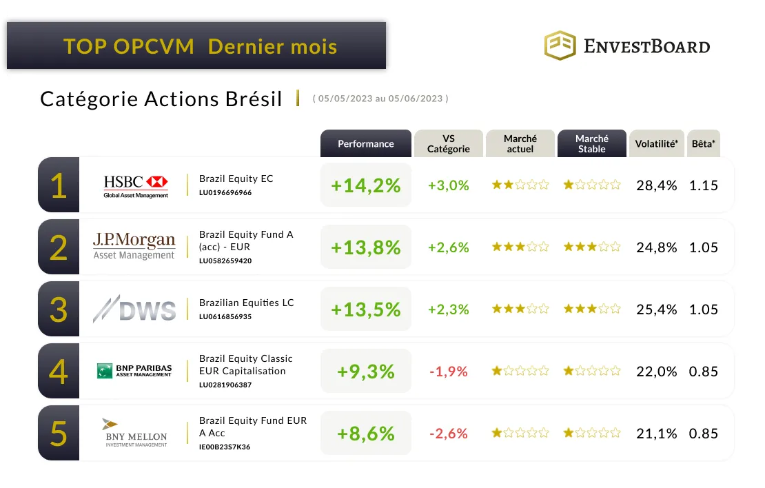 Dans ces conditions les différents classements ci-dessous nous permettent de mettre en lumière les OPCVMs de la catégorie Actions Brésil dans différents scénarios.