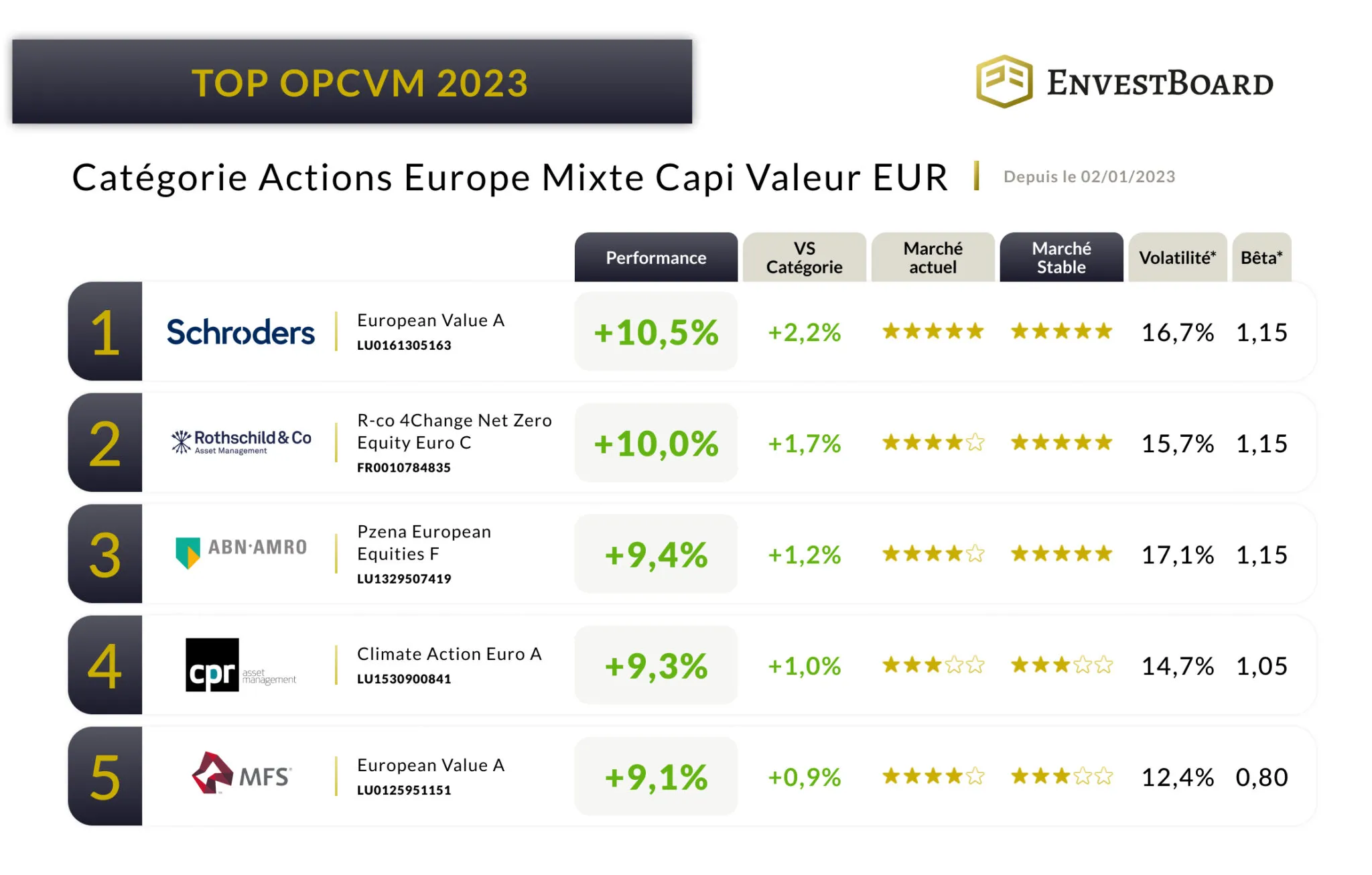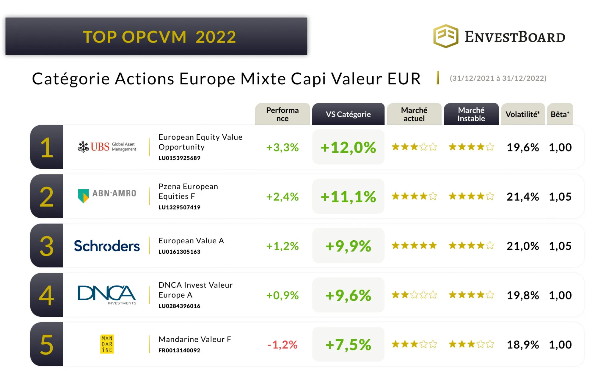 Dans ces conditions, les différents classements ci-dessous nous permettent de mettre en lumière les OPCVMs de la catégorie Actions Europe Mixte Capi Valeur dans différents scénarios.